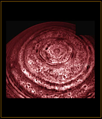 "It's amazing to see such striking differences on opposite ends of Saturn's poles," said Bob Brown, team leader of the Cassini visual and infrared mapping spectrometer at the University of Arizona. "At the south pole we have what appears to be a hurricane with a giant eye, and at the north pole of Saturn we have this geometric feature, which is completely different."