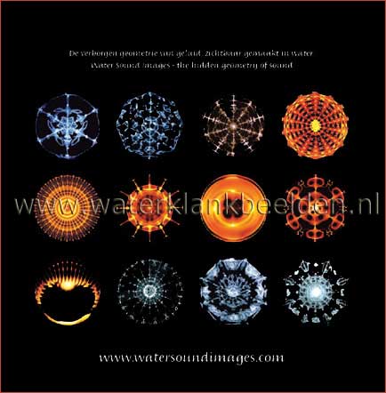 Nieuw op deze website. De Water Sound Images Verjaardags Kalender. Elke maand laat een schitterende afbeelding van een waterklankbeeld zien. Elke afbeelding is het resultaat van een wateroppervlak dat door middel van een bepaalde frequentie aan het trillen gebracht is. Het resultaat is dat de golven het licht boven het water reflecteren (licht op de afbeelding) en de dalen het licht absorberen (donker).
